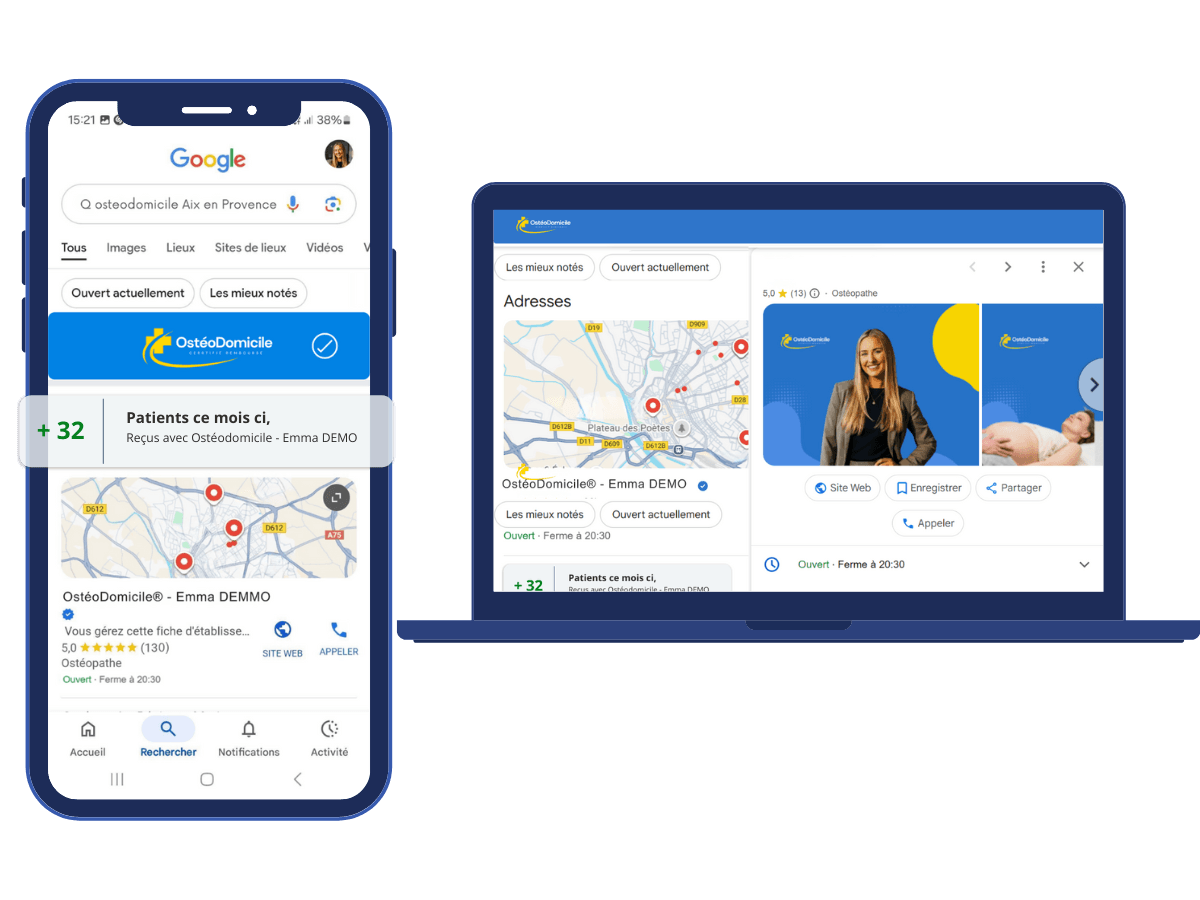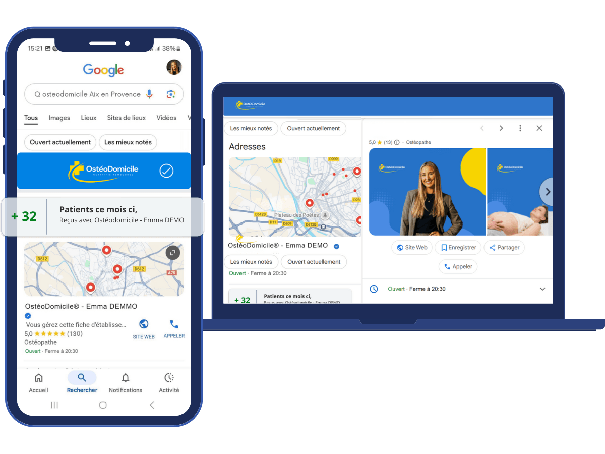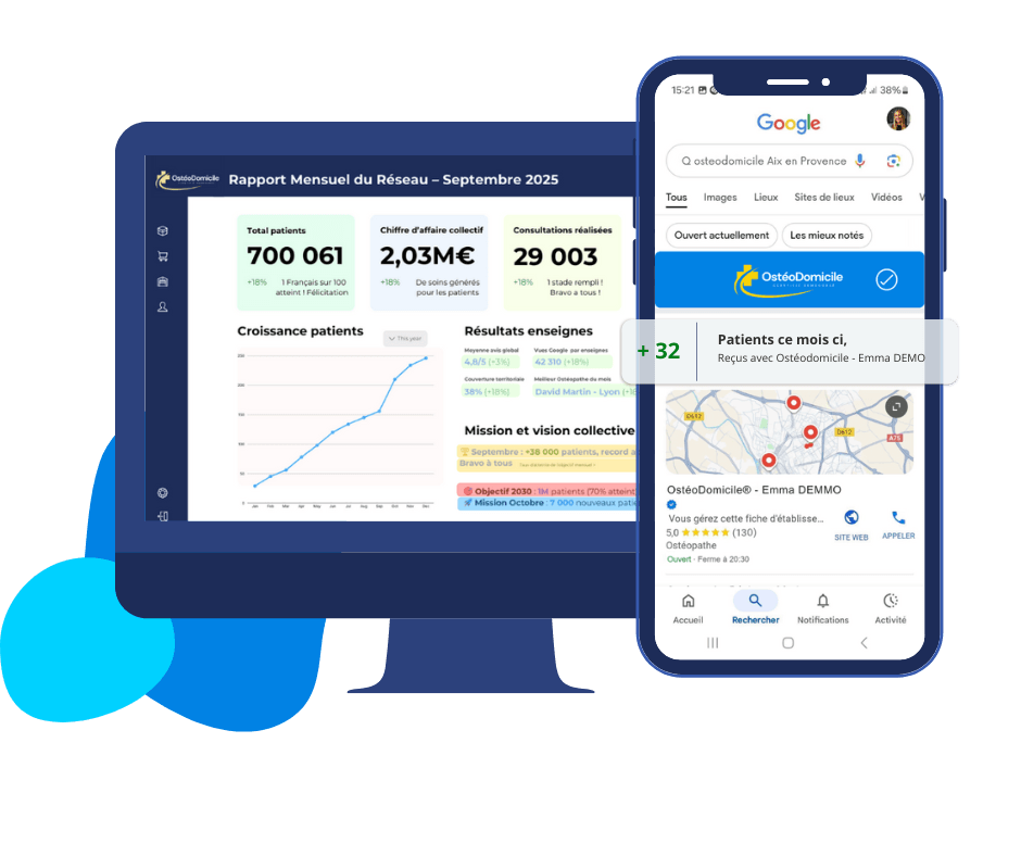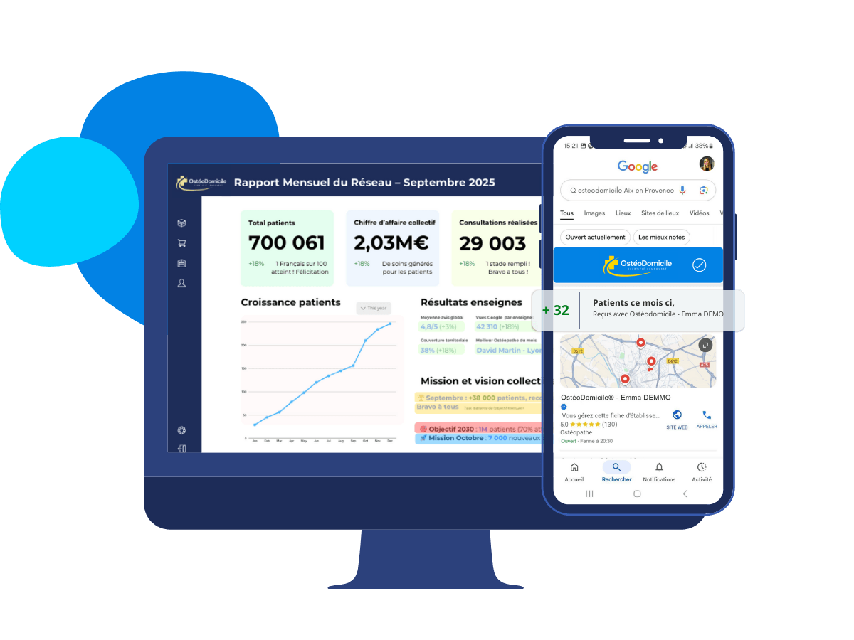 OsteoDomicile® ne remplace pas votre cabinet, il le valorise : associer cabinet + enseigne OsteoDomicile®, c’est maximiser votre visibilité locale et vos revenus.